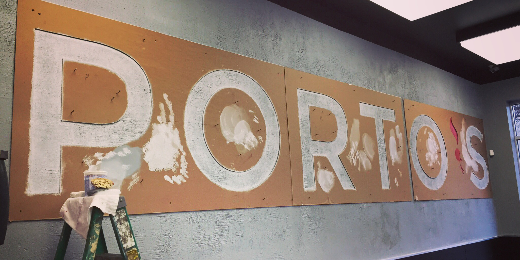 Rustic Stencil Logo on faux design wall.